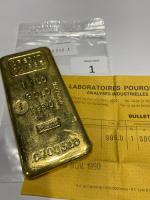 LINGOT or 1 kg, titre or fin 995, n°127664. Bulletin d'essai Laboratoire Pourquery. Lot vendu...