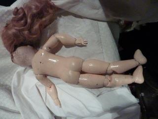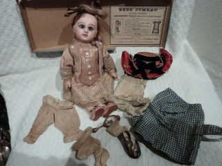 Poupée tête biscuit marquée à l'ancre de marine « Petite Française JV France 6D Liane », beaux yeux en émail bleu fixes, bouche ouverte, calotte carton collée, perruque rapportée en cheveux naturels blonds à anglaises. Tête montée sur un beau et rare corps BRU en bois tout articulé : épaules, coudes, poignets, hanches, genoux, chevilles, avec articulations à boules, beau corps repeint autrefois, les 2 pouces et 2 petits doigts des mains manquent ! bout des doigts de pieds un peu usés. Ht du corps : 35 cm, ht totale : 45 cm. Lingerie d'origine : panty et jupon à petite dentelle, chemise en soie écrue. Belle robe de style soie damassé vert d'eau à volants et dentelle écrus, rubans de soie vert d'eau ; chapeau ancien dentelle écrue et bouton de fleurs d'oranger doublé soie vert d'eau, chaussures rapportées en cuir blanc.