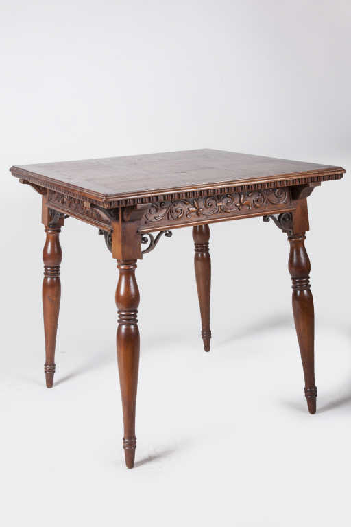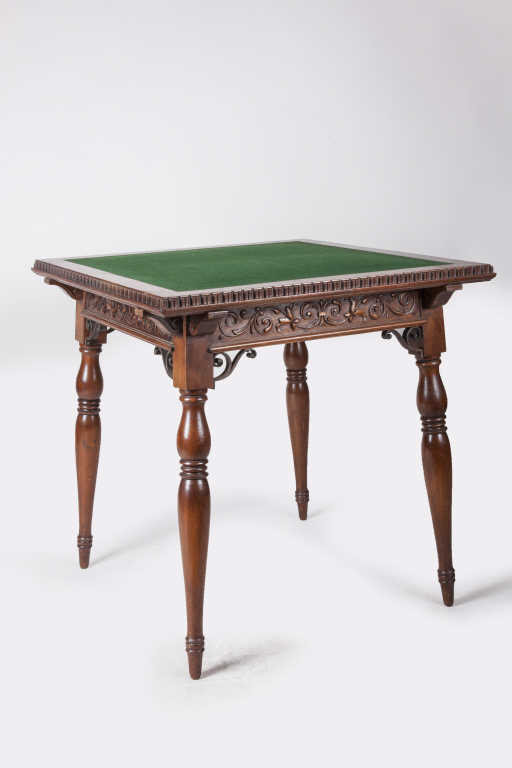 Christian KRASS (1868-1957). Table à jeu en noyer à plateau reversible marqueté et piétement néo-classique à pieds effilés et décoration de fer forgé. Estampillé. H. 72 x L. 70/70 cm.