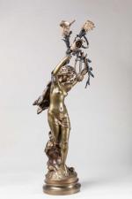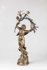 Mathurin Moreau (1822-1912). « Jeune femme symboliste aux branchages ». Sujet lumineux en bronze polychrome sur socle...