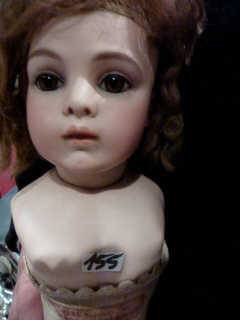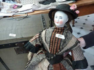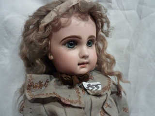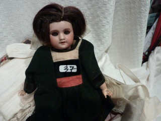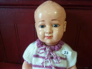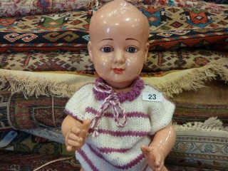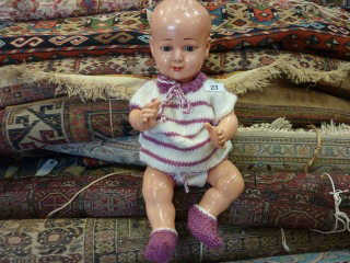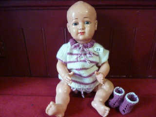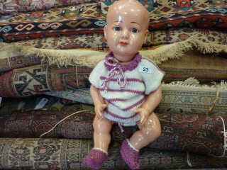Petitcollin France 3, beau baigneur celluloïd marqué en haut du dos, beaux yeux émail bleu fixes, lèvres peintes rouges, cheveux peints moulés châtain clair, corps semi-articulé aux membres arqués, (ancienne trace de colle sous la ligne de moulage du pied droit). Vêtements laine tricotée blancs et roses, H : 49 cm environ.