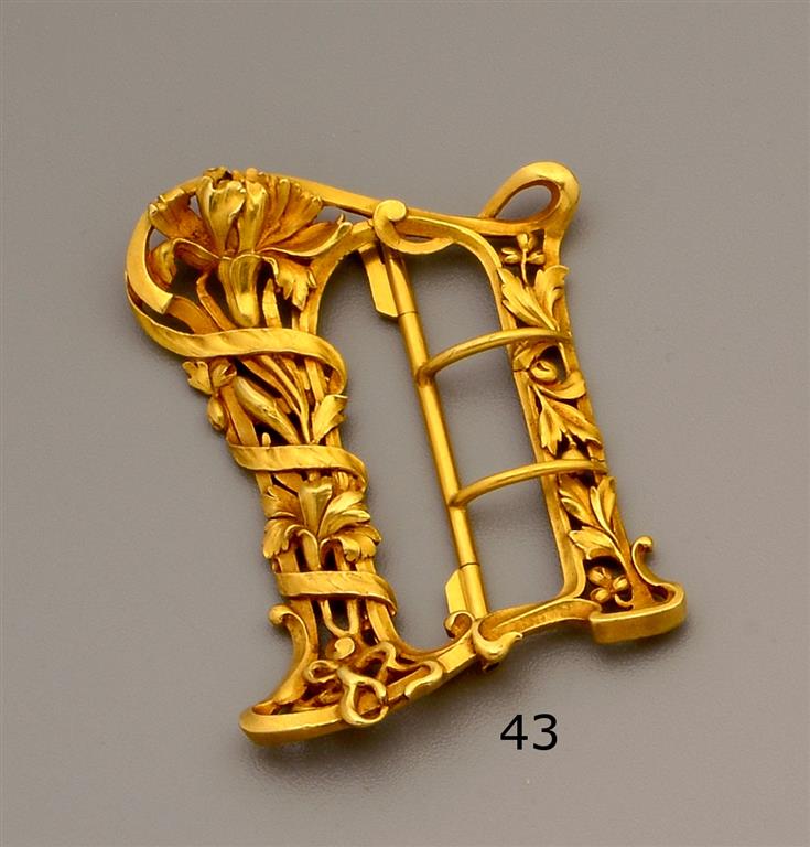 Boucle de ceinture en or jaune à décor végétal, époque Art Nouveau. Poids brut : 28,5 g.