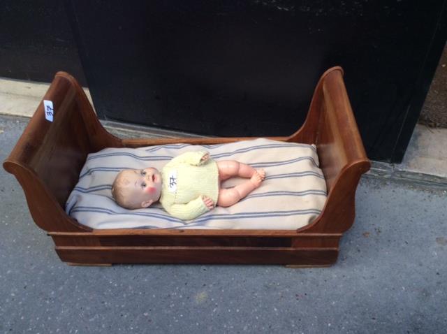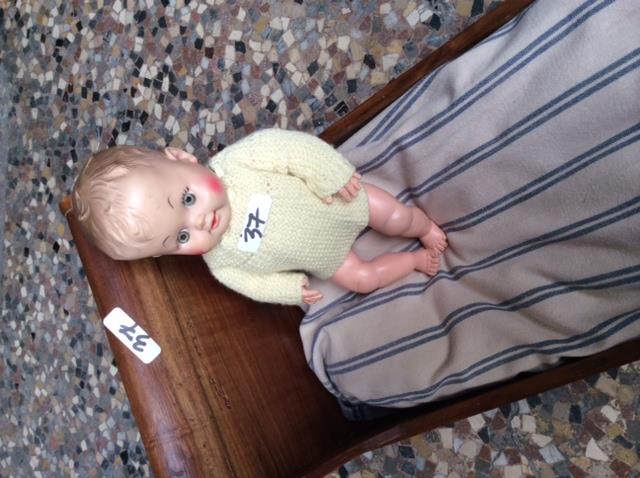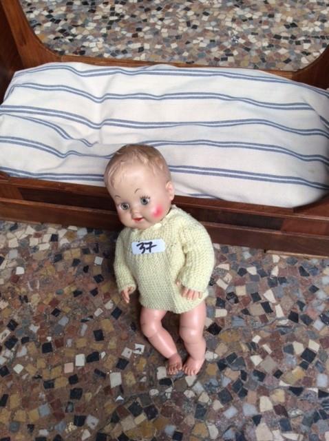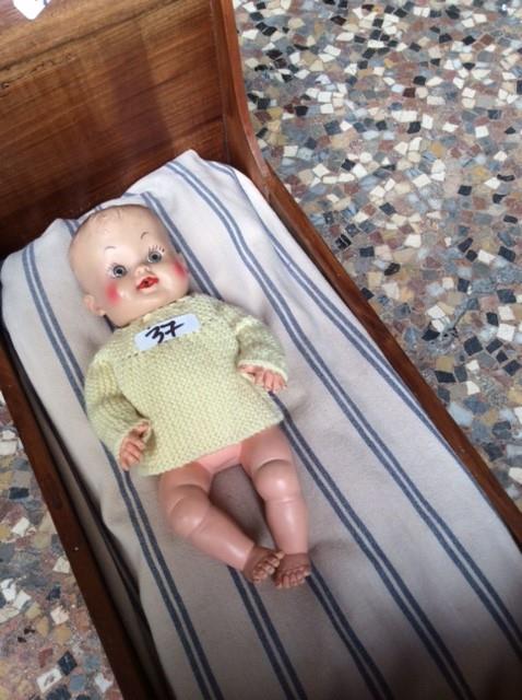 Bébé mouilleur caoutchouc des années 50, la tête s'emboîte sur le corps, yeux fixent gris/bleu, têteur, discret petit manque d'usage petit doigt pied gauche, brassière tricotée main jaune. Ht: 25 cm. Dans son lit bois fruitier style Louis Philippe 25,5x 48x 23 cm.