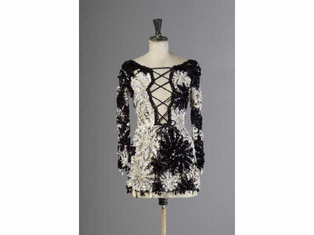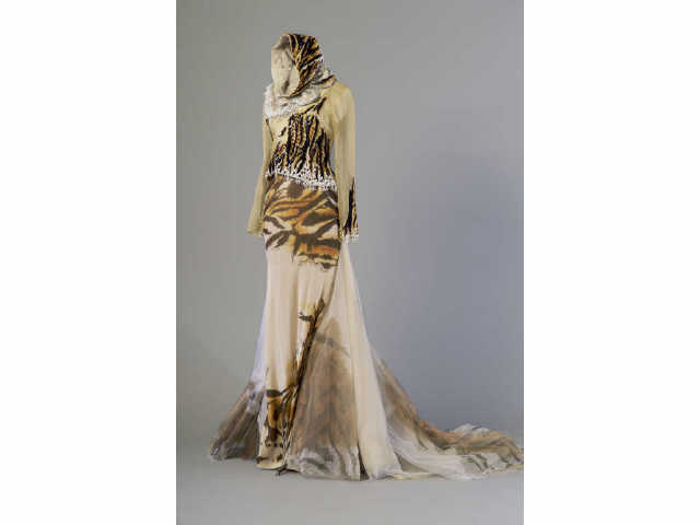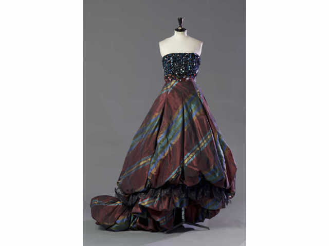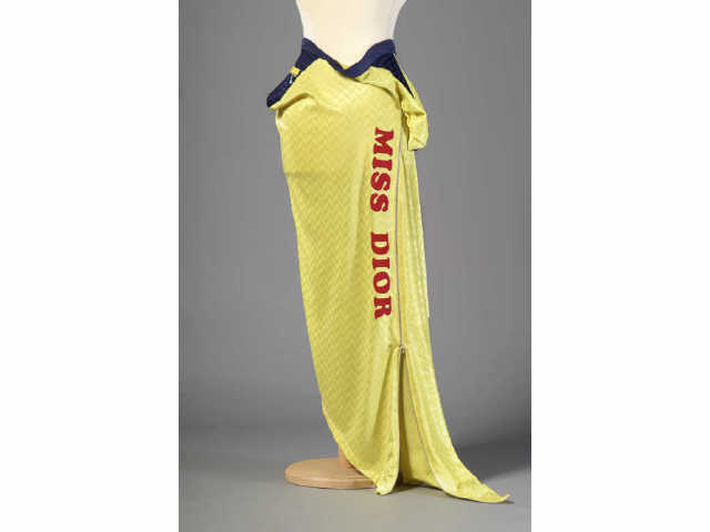 Christian DIOR par John Galliano, Printemps-Eté 2001, Collection Trailer Trash. Jupe longue asymétrique en viscose chevronnée jaune façon tee-shirt de sport portant l'inscription Miss Dior 23 poitrine et dos, taille en bord-côte bleu marine, fermetures éclair. Prototype de défilé, look 41.
