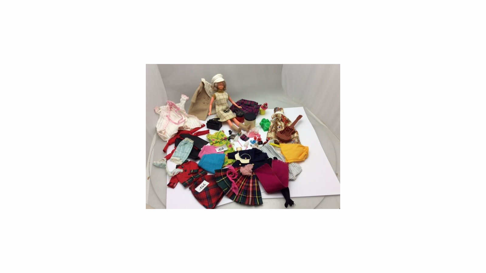 Mily N°1 de Gégé, poupée de 29 cm marquée Gégé, corps en plastique articulé à la taille, jambes raides, tête en vinyle, traits peints, cheveux implantés blonds cendrés avec une raie côté droit. Sous-vêtements: culotte blanche, jupon et soutien-gorge bleu ciel fleuris, et trousseau d'origine vêtements marqués "Haute Couture Gégé/Made in France, déshabillé rose et blanc avec sa chemise de nuit, 2 ensembles: jupe/veste et 1 robe écossaises, jupe rose, jupe turquoise, robe jaune fleurie rose, veste lainage marine, manteau lainage couleur chamois avec bottes assorties, robe lainage rayée vert/beige, 9 paires d'escarpins, ... Bigoudis, filet+brosse roses, joint téléphone vert, guitare plastique marron, fleurs roses en pot jaune, sac noir avec lunettes noires, jumelles, broche ours, coupe à champagne en plastique.