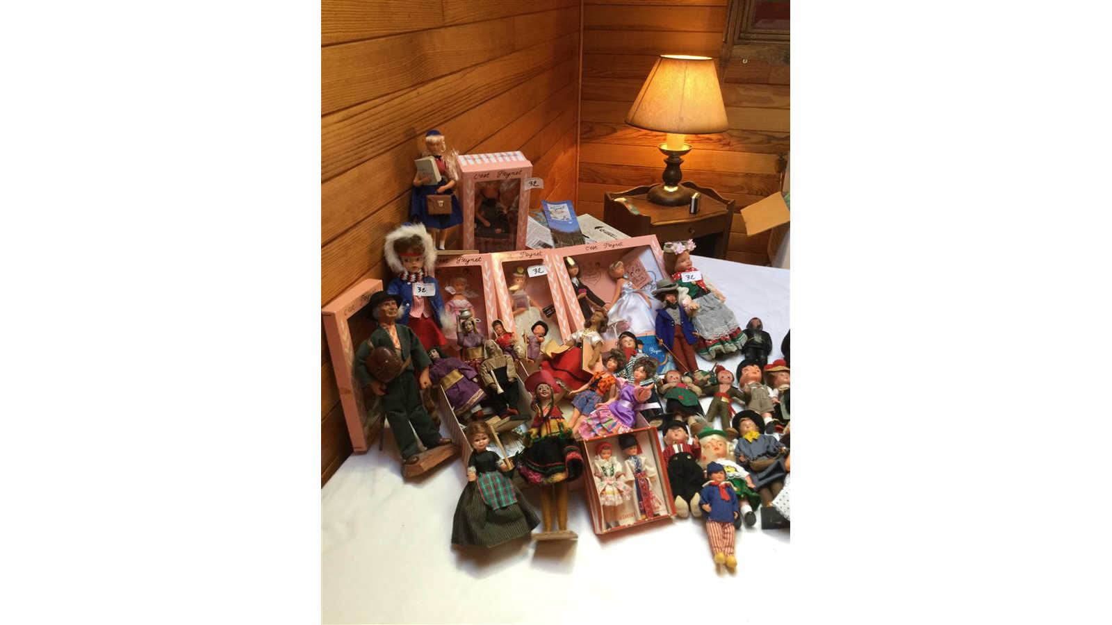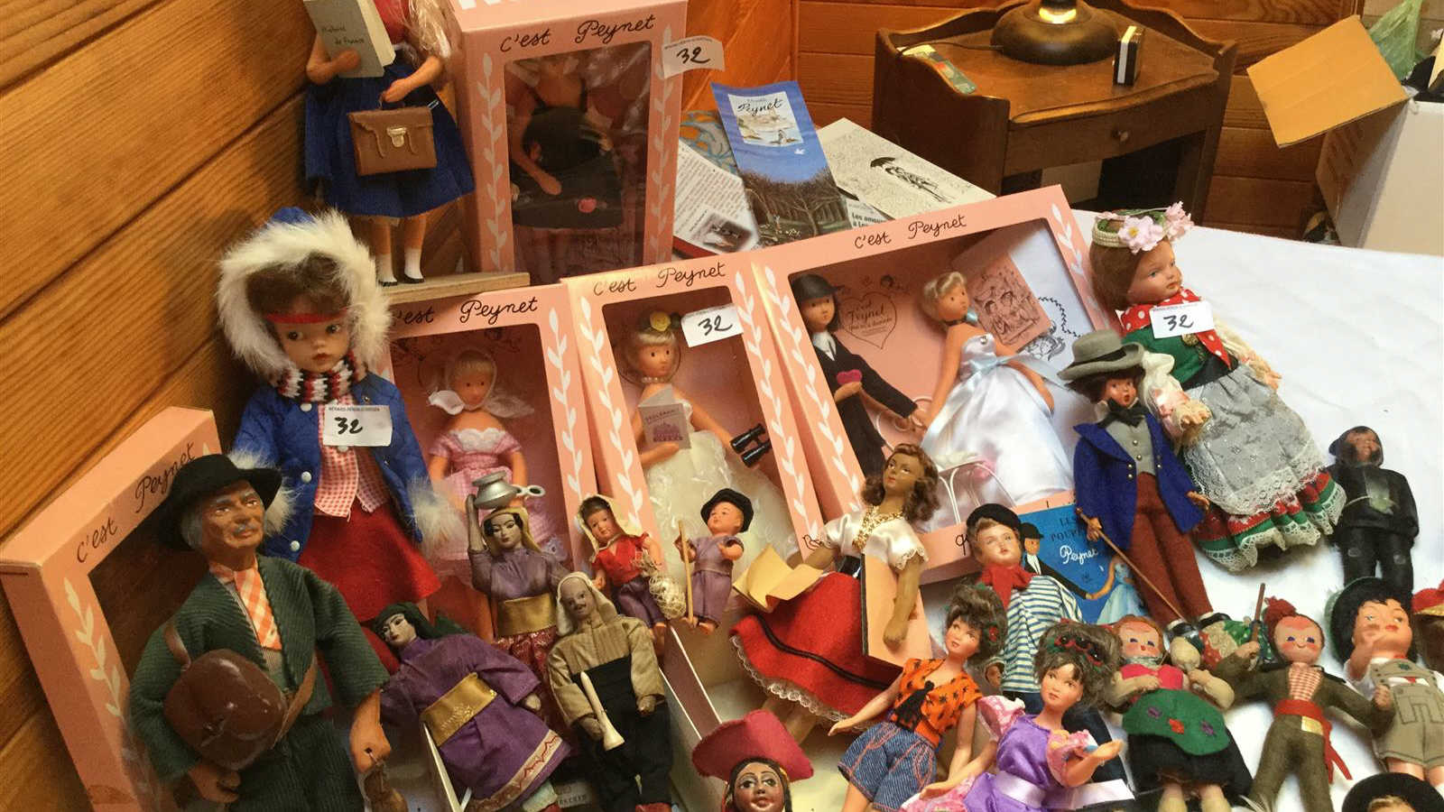 Lot de poupées Peynet dans leur boîte, -1 ancienne « Étudiante » avec cartable, « Histoire de France », -4 contemporaines: starlett, opéra, Miss Twist, Les Amoureux, -Lâge du Bac, -poupée anglaise vinyle costume patins à glace, 30 cm. -santon terre cuite chasseur avec lapin besace fusil, 27,5 cm, -une vingtaine de poupées folkloriques dont 3 libanaises, Portugal, Alsace, le dandy vêtements feutrine (Austria) 19,5cm.