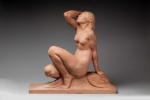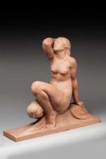 Jean Ortis (Amedeo Gennarelli). "Femme nue accroupie". Terre cuite. Edition Susse. Signée. H. 62 cm L. 63 cm. TR.