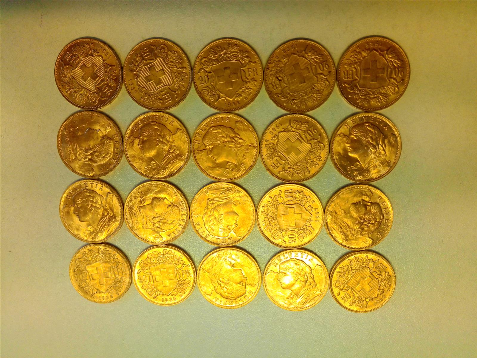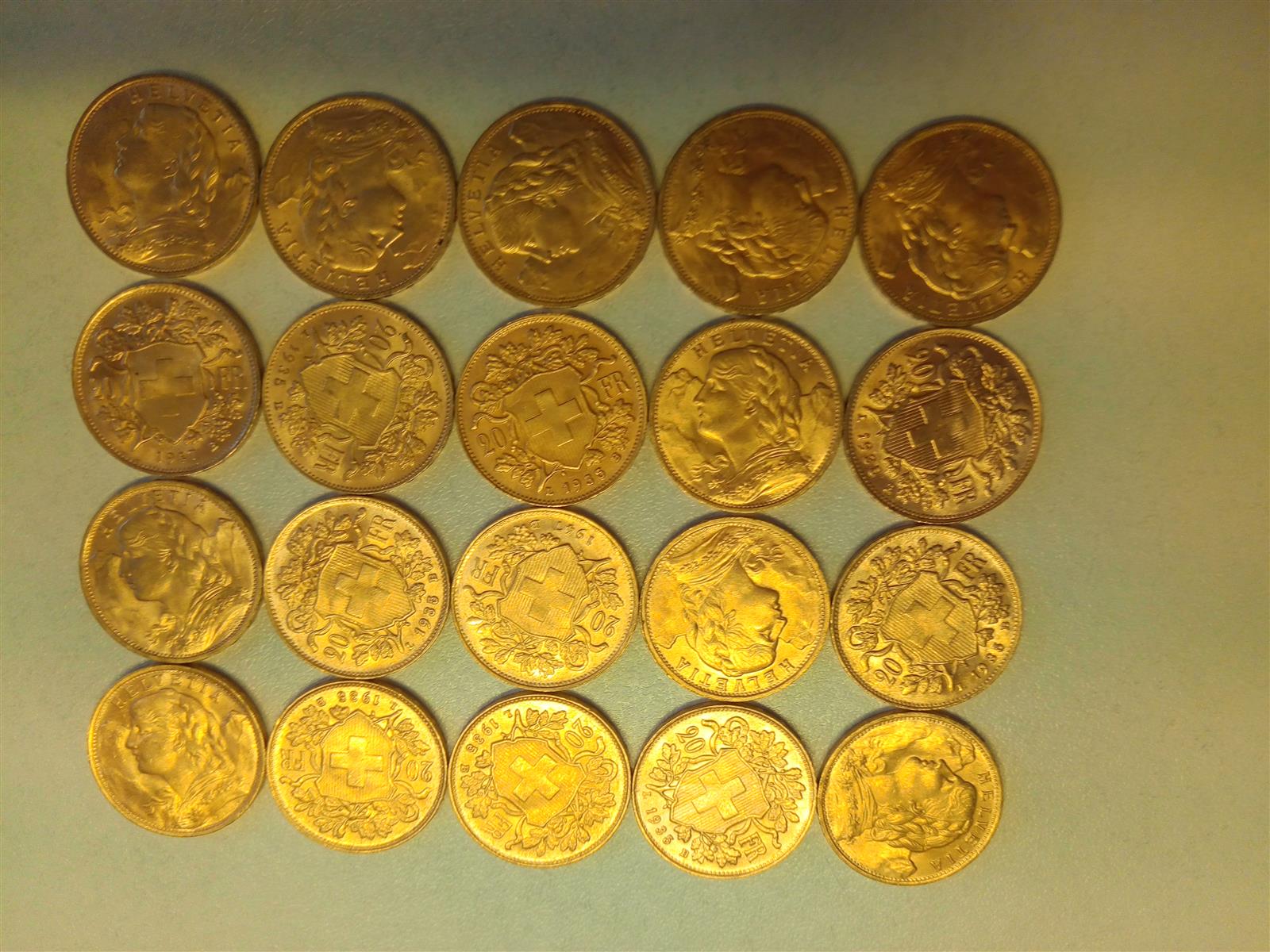 VINGT PIECES de 20 FRANCS SUISSE OR, 1922 (x3), 1930 (x4), 1935 (x10), 1947 (x3)....