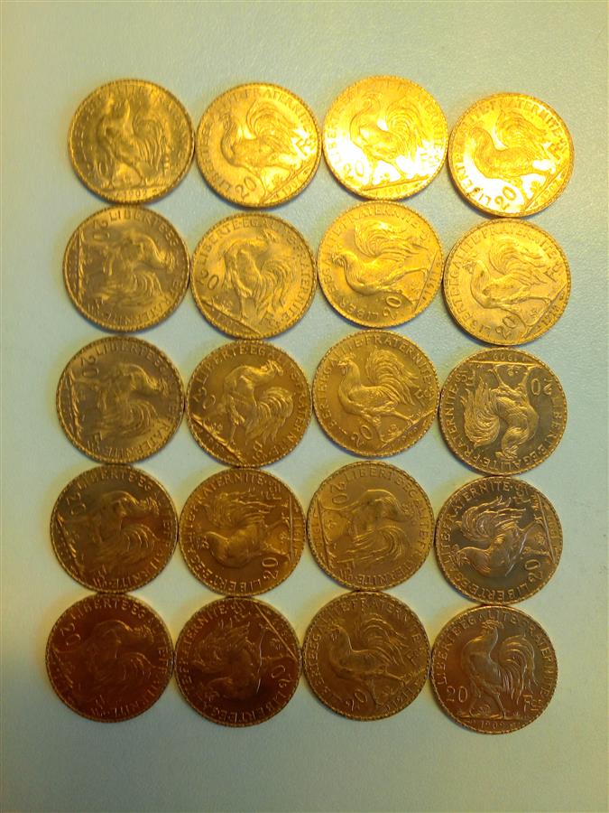 VINGT PIECES de 20 FRANCS OR, 1902 (x1), 1903 (x1), 1904 (x1), 1907 (x3), 1909...