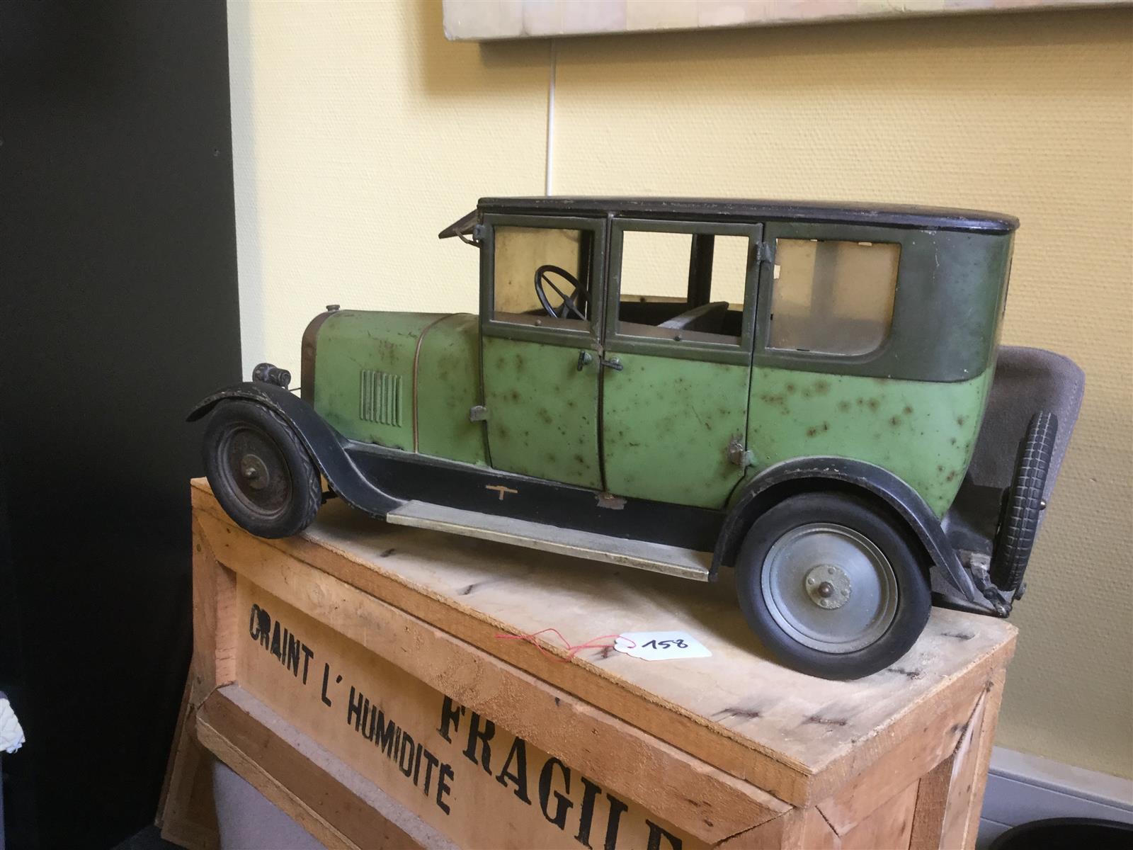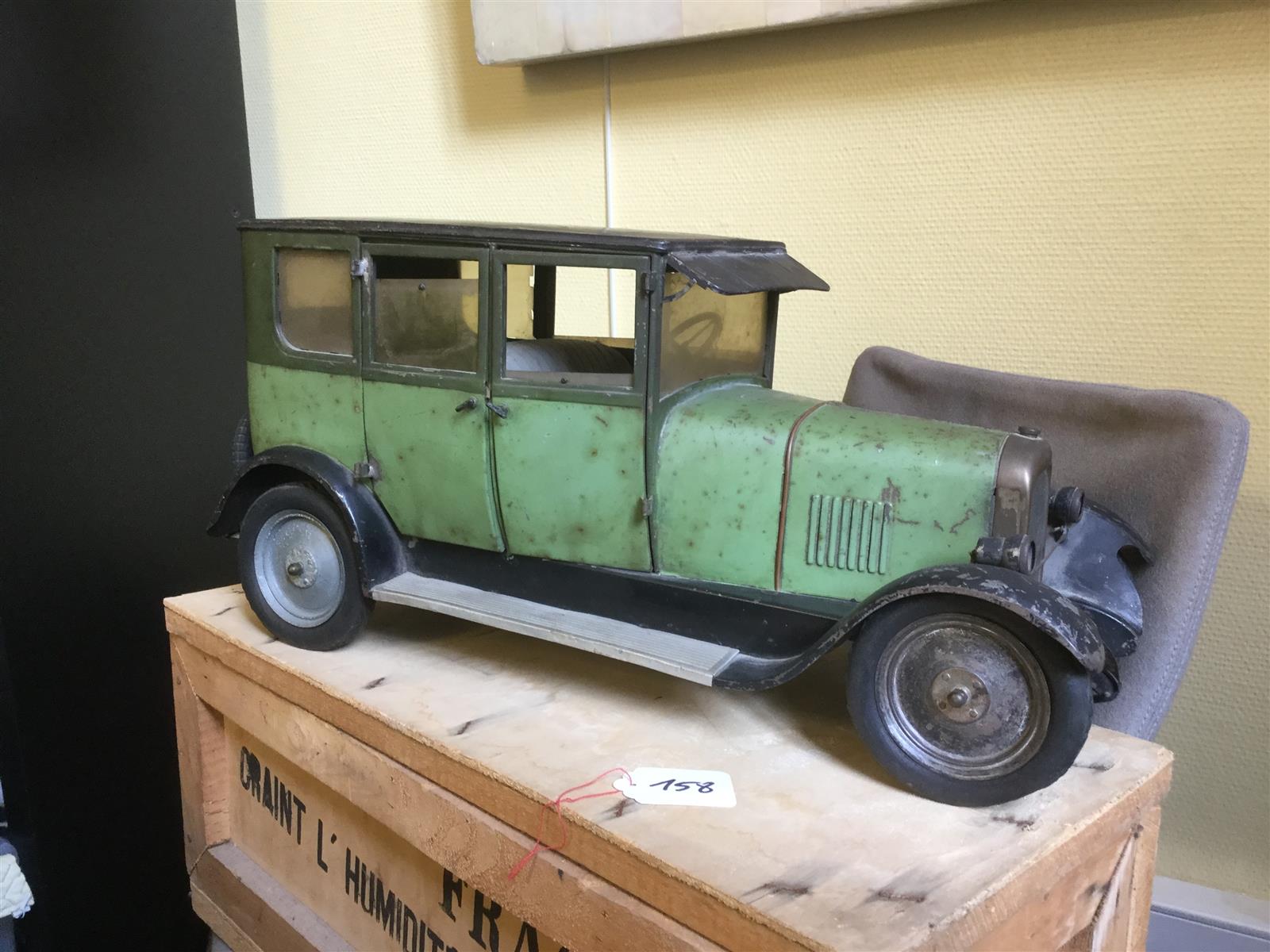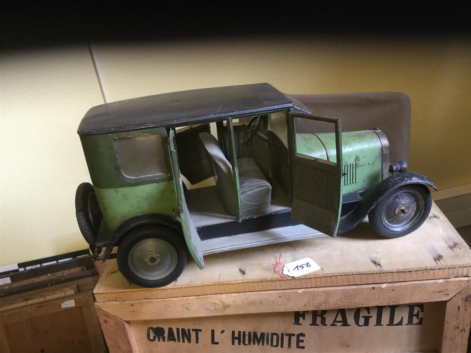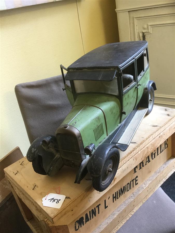 Jouet André CITROËN grande limousine B14 au 1/7è Longueur: 54 cm, en tôle peinte à 2 tons de vert, direction à crémaillère, 4 portes ouvrantes, 4 vitres descendantes, phares électriques, pneus caoutchouc, roue de secours (caoutchouc fendu), immatriculation avant/arrière " 1375-U5 ", moteur absent, petites restaurations, jouet à nettoyer.