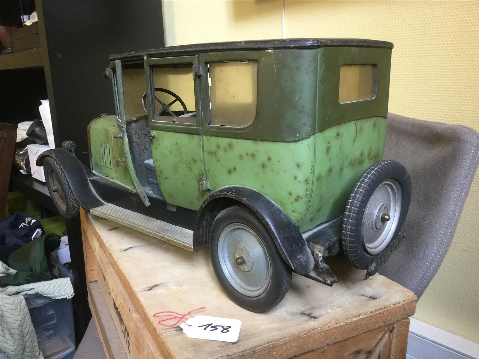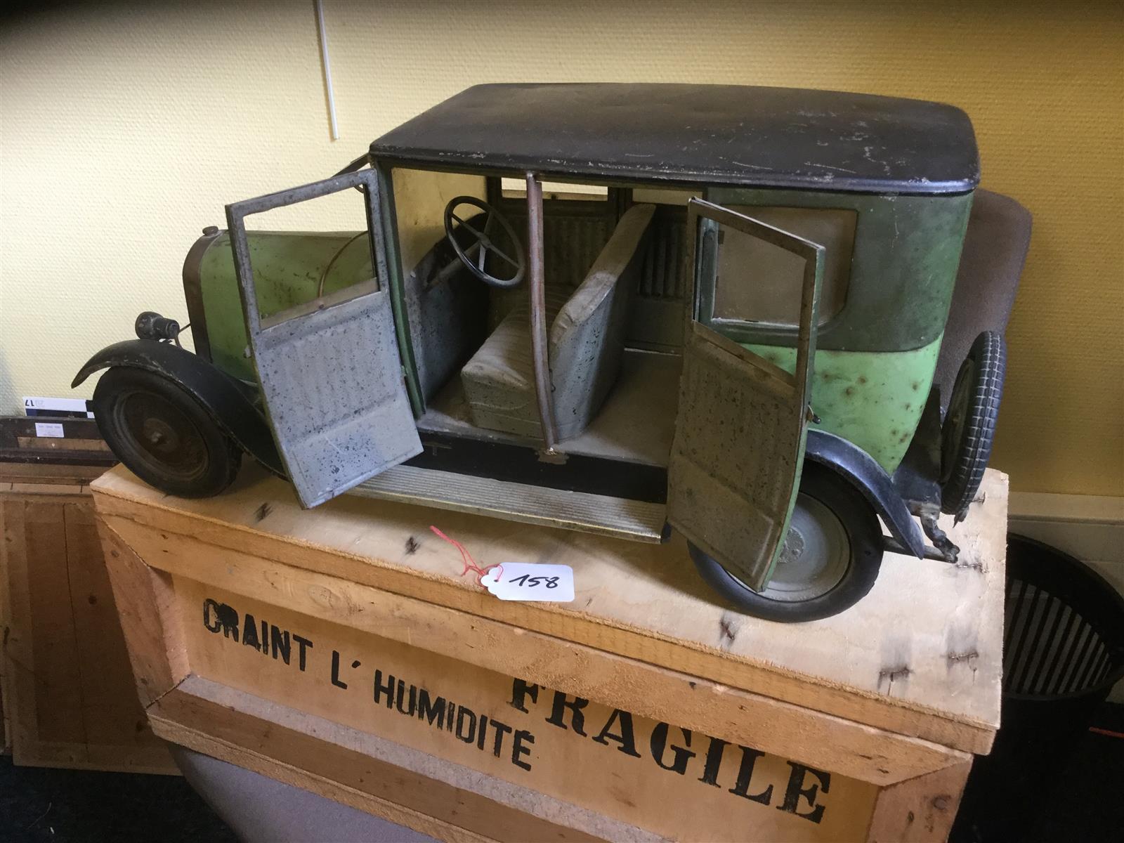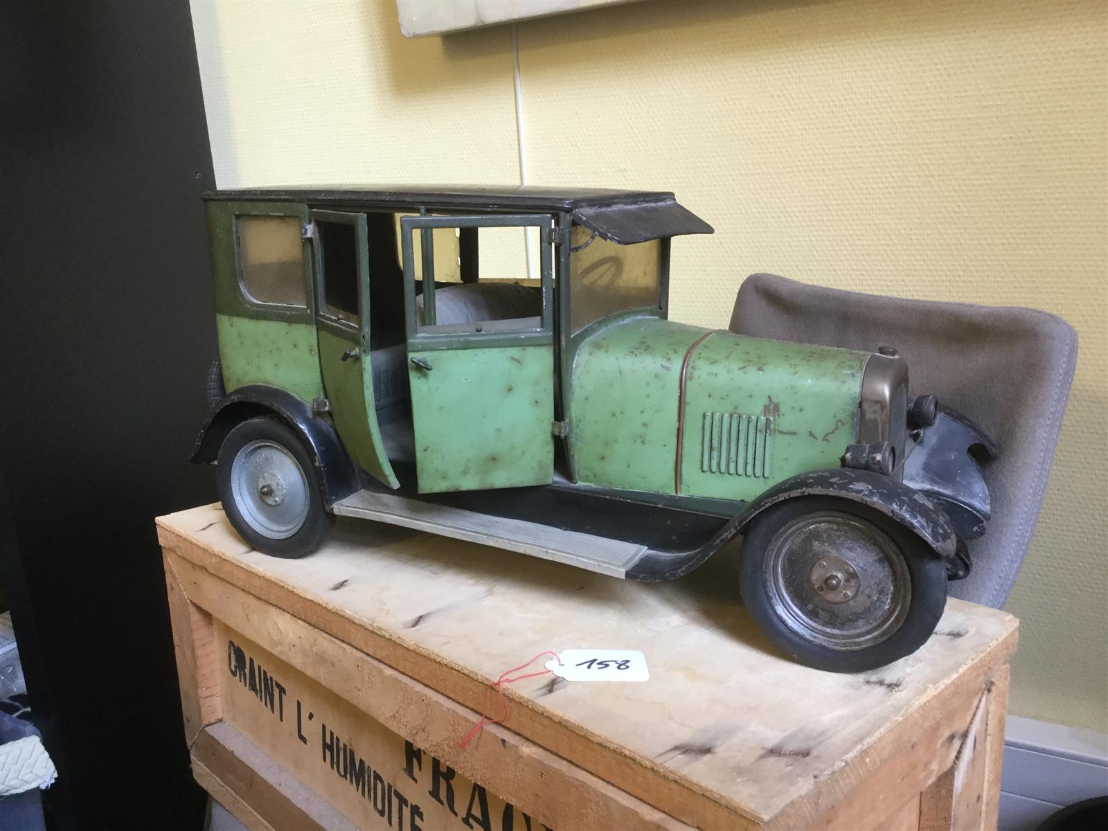 Jouet André CITROËN grande limousine B14 au 1/7è Longueur: 54 cm, en tôle peinte à 2 tons de vert, direction à crémaillère, 4 portes ouvrantes, 4 vitres descendantes, phares électriques, pneus caoutchouc, roue de secours (caoutchouc fendu), immatriculation avant/arrière " 1375-U5 ", moteur absent, petites restaurations, jouet à nettoyer.