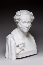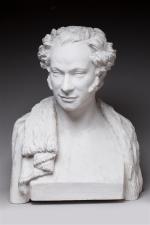 Clémence Sophie de SERMEZY ( 1767 - 1850 ) d'après. BUSTE en plâtre représentant un homme, tête de trois-quart, une cape à col de fourrure sur ces épaules, marqué au dos de Mme de SERMEZY, 1797.