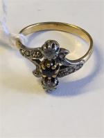 BAGUE en or jaune et gris 750/°° ornée d'un saphir et de diamants taillés en brillant. PB: 3.8 g.
