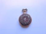 Petite MONTRE de col en or jaune 750/°°, le cadran émaillé blanc, chiffres arabes rouge et index point, le revers orné de rubis et diamants taillés en rose et brut. PB:14.3 g. Dans sa boite manque le verre, un diamant et un rubis.