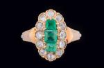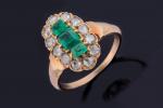 BAGUE Marquise en or jaune 750/°° ornée de trois émeraudes rectangulaires à pans coupés dans un entourage de diamants taillés en rose. TDD: 51. PB: 3.4 g. Egrisures, une émeraude fissurée.