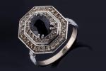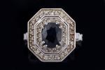 BAGUE en or gris 750/°° orné d'un saphir central avec entourage de brillants sur une base octogonale. TDD: 55. PB : 4,3 g.
