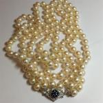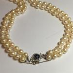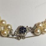 COLLIER de perles de culture sur deux rangs, le fermoir en or gris 750/°° , diamants et saphirs. PB: 99.4 g.