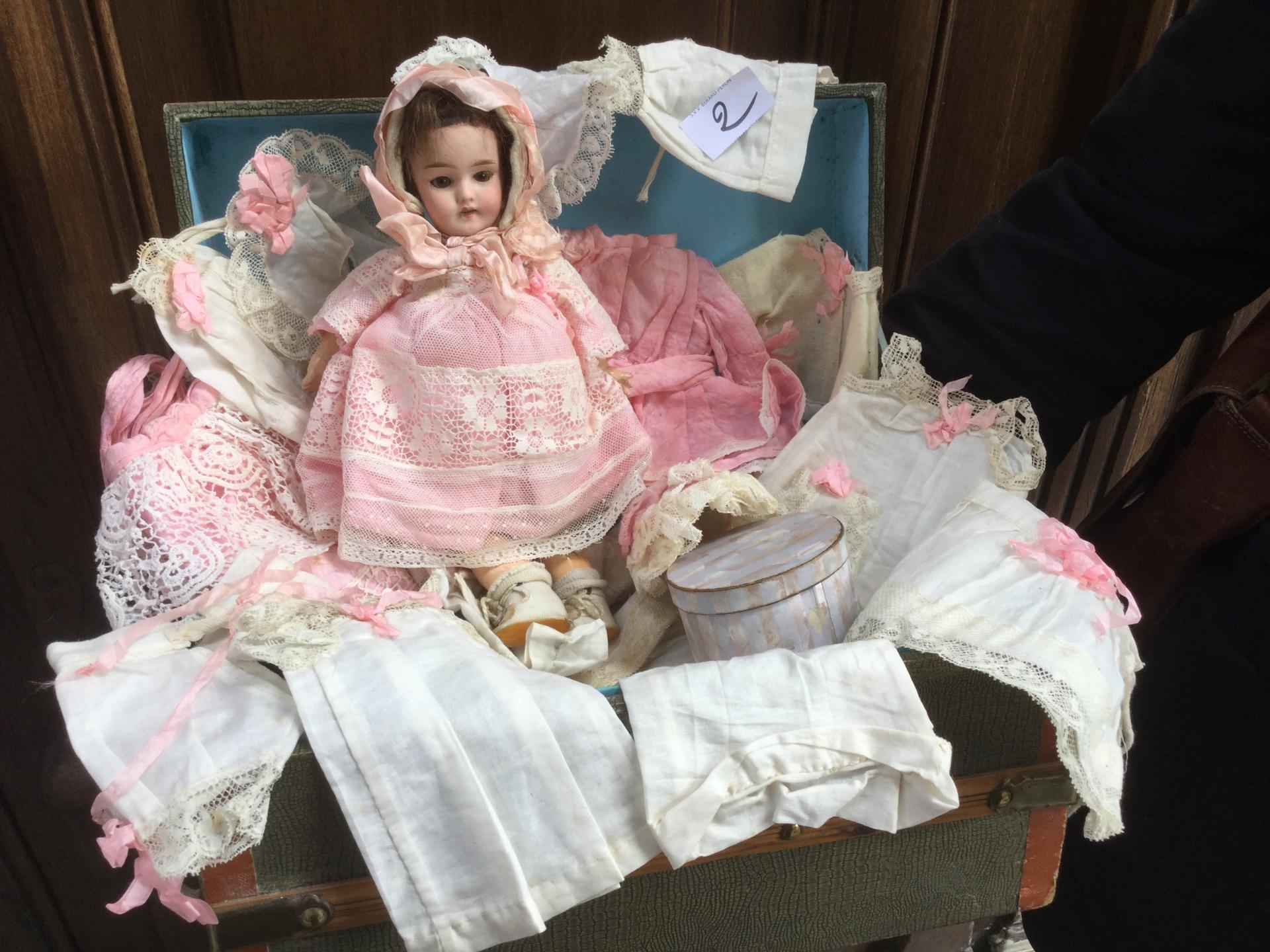 -Joint ravissante malle de poupées 18x30x17cm, en trompe-l'oeil croco bordeaux, à lanières beiges cloutées, l'intérieur tapissé papier motifs bleu pâle. serrure (pas de clé), 2 anses (l'1 à refixer).