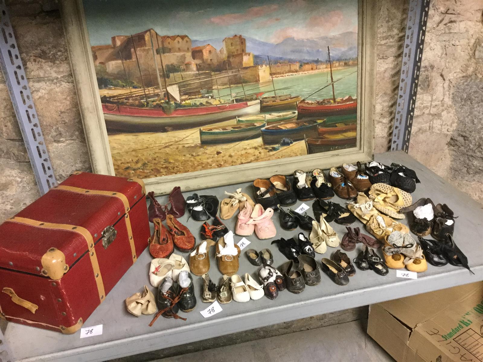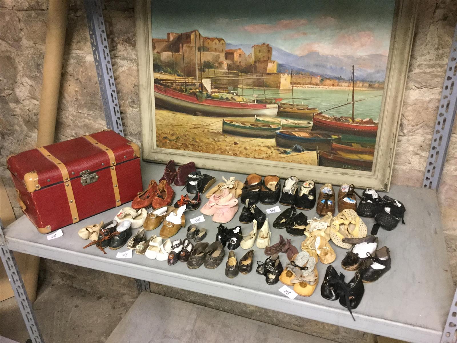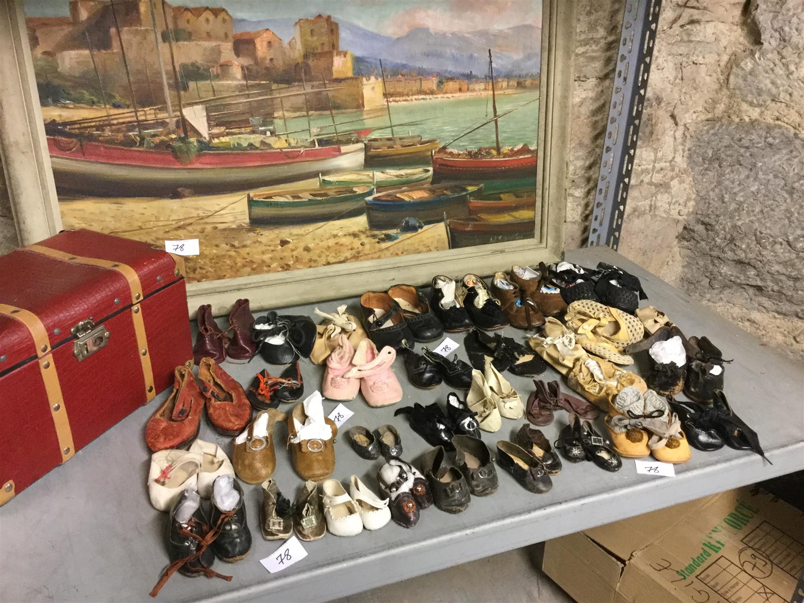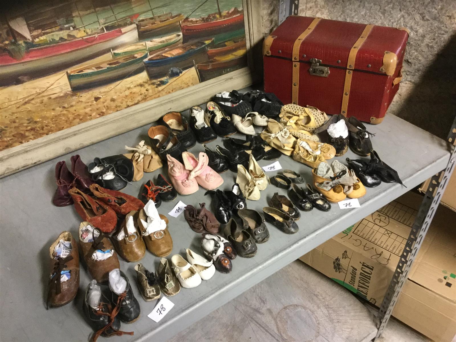 Beau lot de 32 paires de chaussures anciennes de poupées, surtout en cuir, ..peau, tissu, ..couleurs: foncé, beige, blanc, rose, marron, .. différentes tailles ..4,5cm, 6cm, 8cm, 12 cm, 12,5cm, etc .. numéroté 11, ...