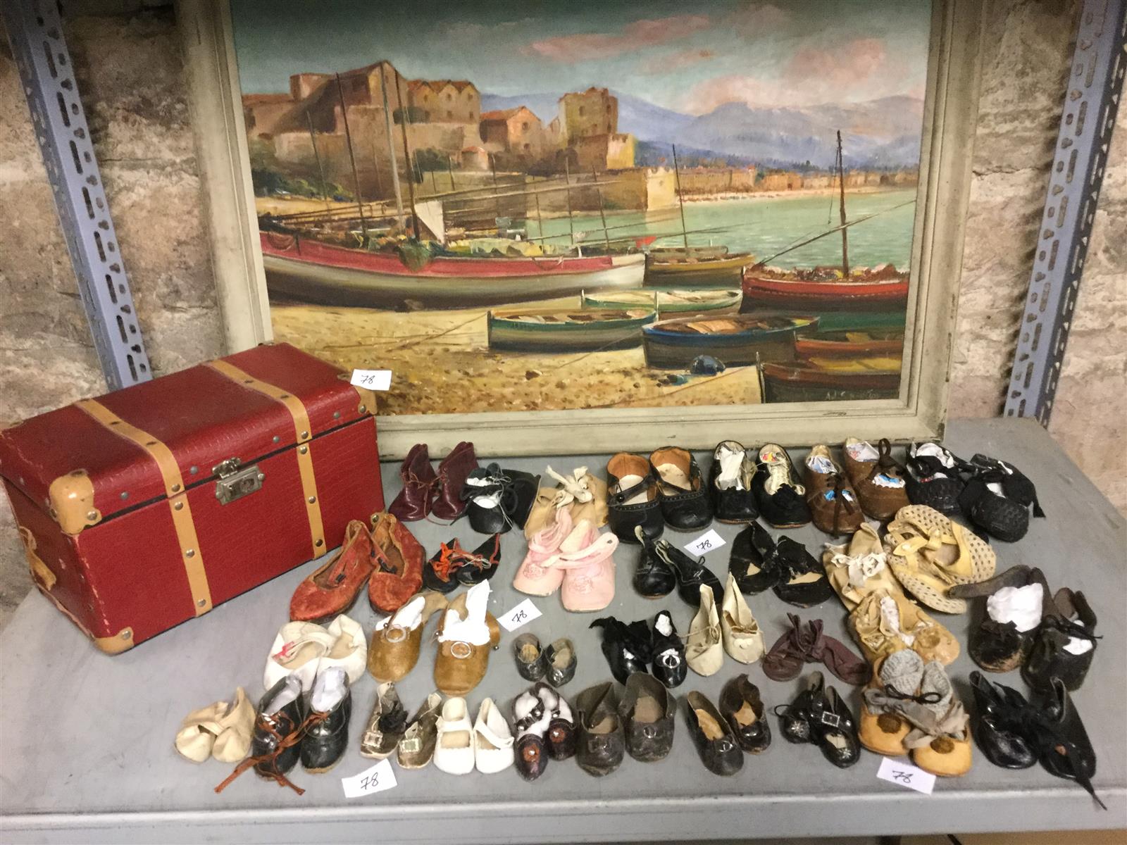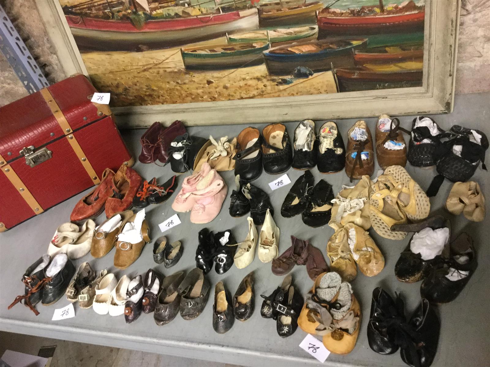 Beau lot de 32 paires de chaussures anciennes de poupées, surtout en cuir, ..peau, tissu,...