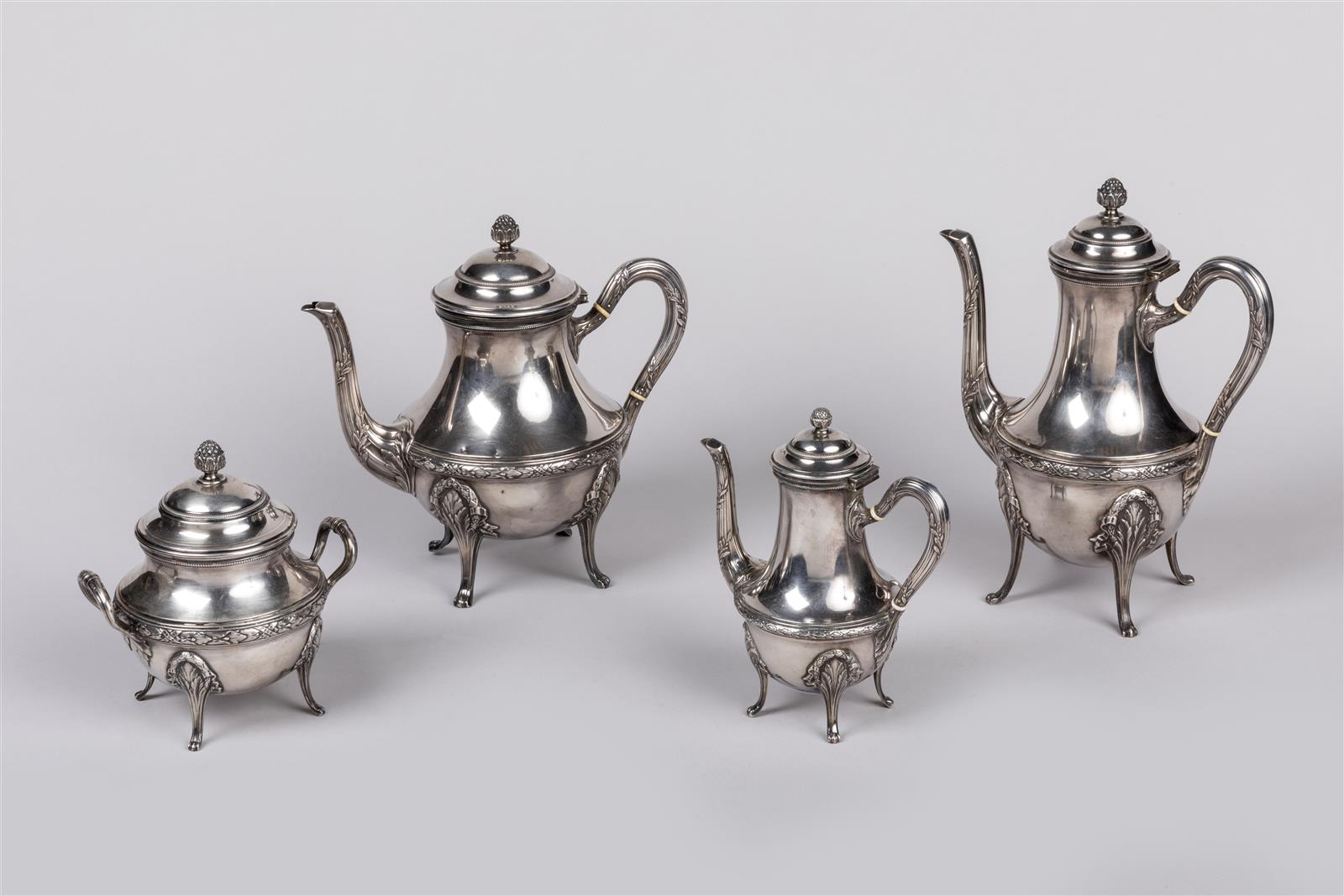 Emile PUIFORCAT - SERVICE THE CAFE en argent à décor de frise de lauriers comprenant: cafetière, théière, sucrier, pot à lait. Style Louis XVI, époque Napoléon III. Poinçon Minerve. Poids total : 2240 g.
