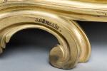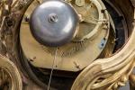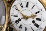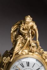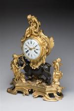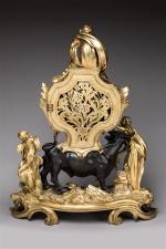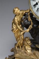 Importante PENDULE à décor de "L'enlèvement d'Europe" en bronze doré et bronze patiné, sur une terrasse de rochers et feuillages soutenue par de grandes volutes d'acanthe. Le cadran émaillé, signé de CAUSSARD, horloger du Roy, suivant la Cour, repose sur le dos du taureau et est surmonté d'Europe retenant une guirlande de fleurs ; de part et d'autre ont trouvé place une nymphe et l'amour sur une nuée. Signée Saint-Germain au dos d'une volute. Epoque Louis XV. H. 56 cm. Petites restaurations, petites parties redorées, infime manque sur la terrasse.