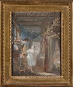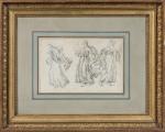 Suite de quatre TORCHERES en métal relaqué à décor d'Egyptiennes aux cheveux nattés, coiffées de...