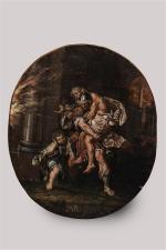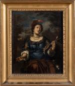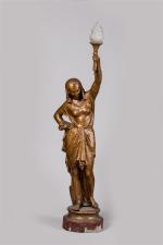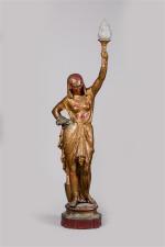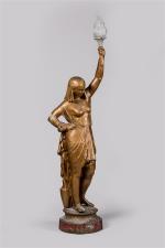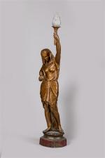 Suite de quatre TORCHERES en métal relaqué à décor d'Egyptiennes aux cheveux nattés, coiffées de couronnes, vétues de robes courtes, bras droit sur la hanche et bras gauche levé tenant une flamme en verre dépoli.Epoque seconde moitié du XIXème siècle. H. totale 188 x 56 x40 cm. Petits accidents et manques.