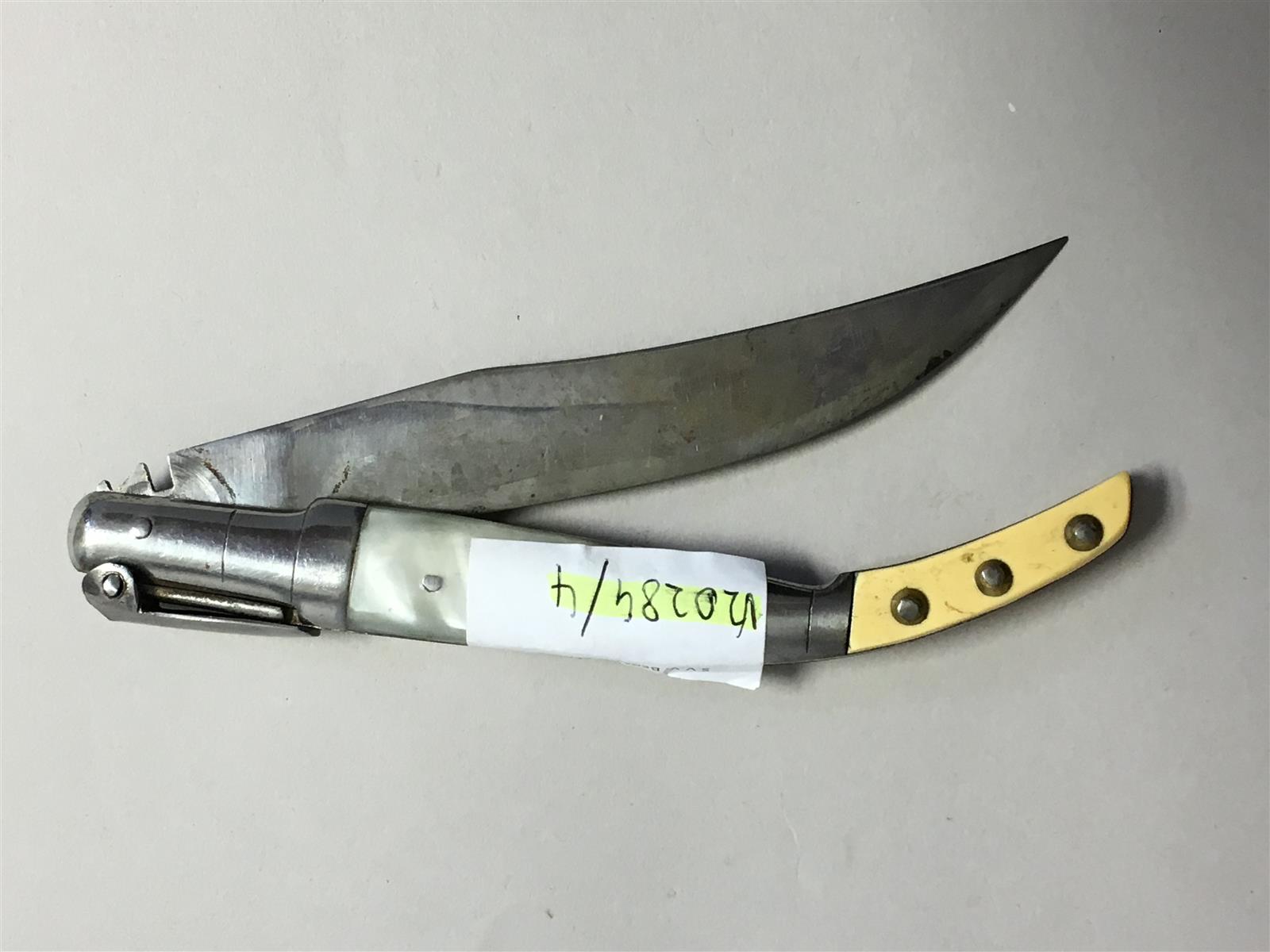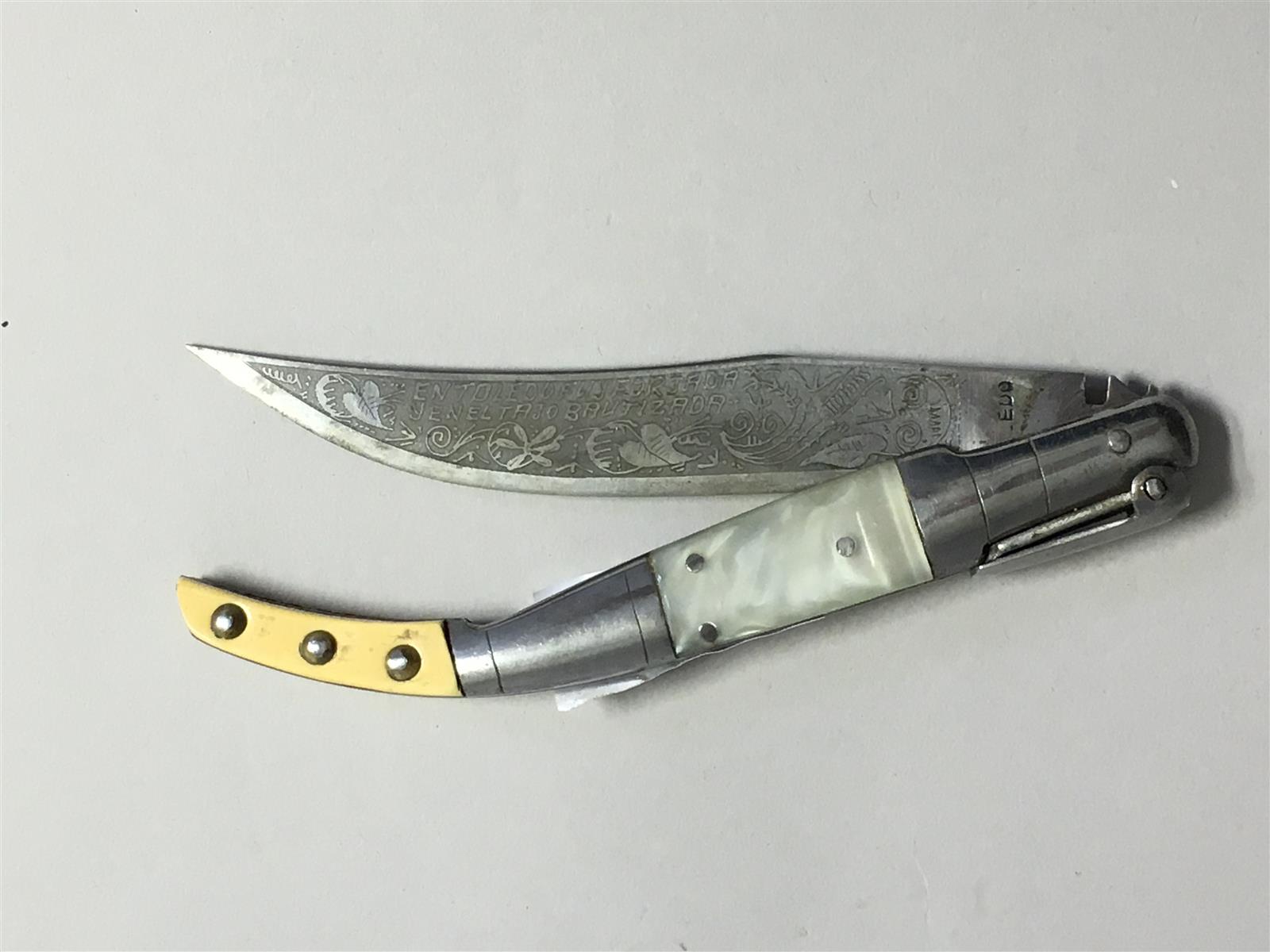Manche metal nacre et os, lame à un tranchant entièrement gravée à l'eau forte en suite et marquée de Tolede , système mecanique à cran