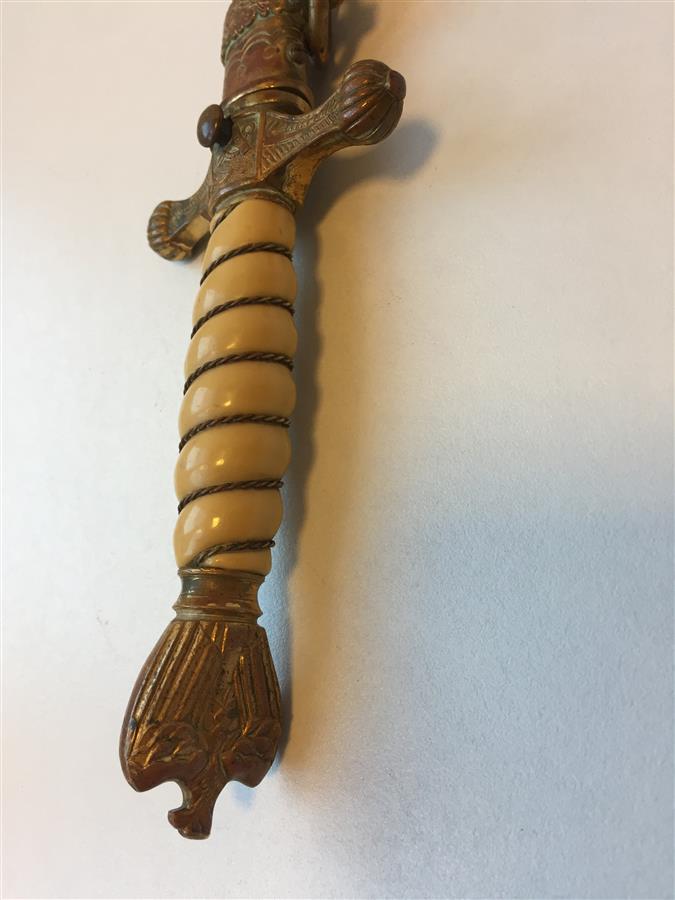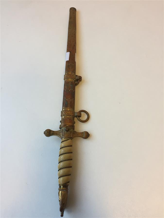 En laiton, pommeau à l'aigle surmontant une svastika , poignée celluloïd blanche filigranée, croisière à l'ancre, lame gravée en suite de décor floral et marquée au talon du fabricant eickorn avec son logo, fourreau laiton ciselé deux anneaux