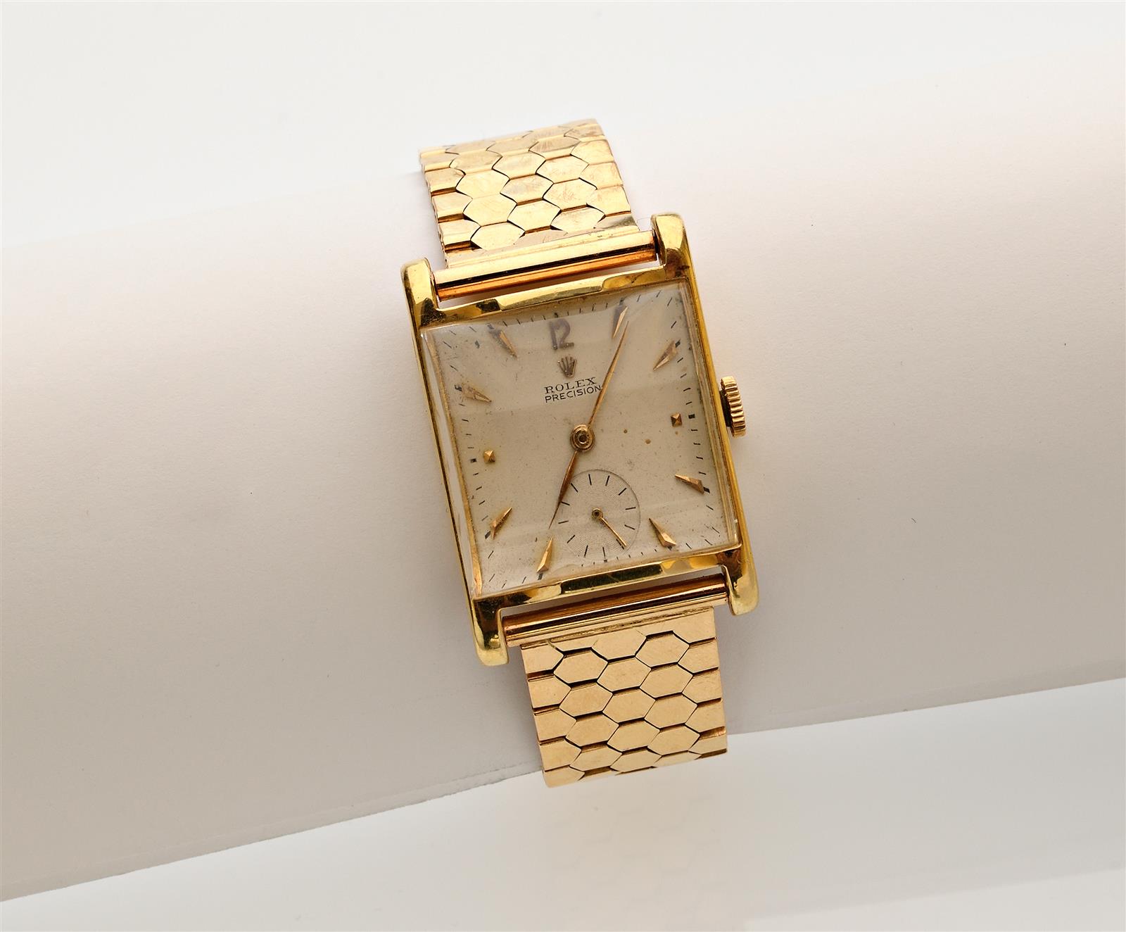 ROLEX - MONTRE bracelet d'homme, modèle "PRECISION", en or jaune 750/°°. Boitier carré, cadran à fond blanc avec index épis appliqués, petite trotteuse à six heures. Bracelet en or jaune 750/°° à maillons abeille articulés, fermoir clapet à échelle. Mouvement mécanique signé. PB : 70,7 g. Rayures et légers chocs.
