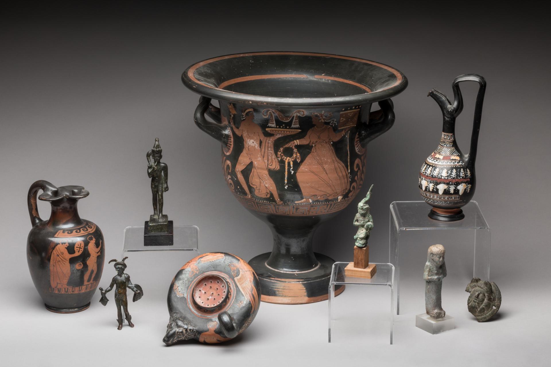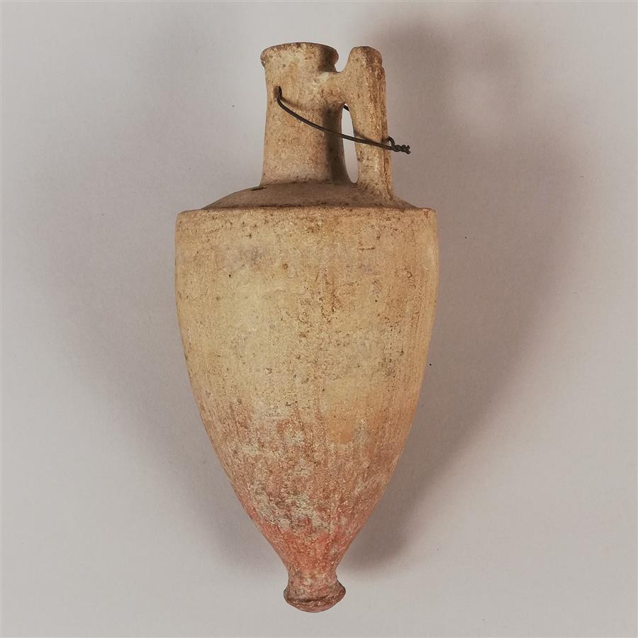 Petite amphore en terre cuite de forme balustre munie d'une anse, renfermant à l'intérieur une 2e amphore. Epoque romaine. H: 23 cm