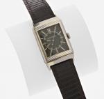 JAEGER-LECOULTRE - Reverso - MONTRE bracelet en acier, boîtier rectangulaire, cadran noir, chiffres arabes, index bâtons appliqués, mouvement à remontage mécanique. Bracelet de cuir marron à boucle ardillon Numérotée 12134. 28 x 22 mm. Rayures.