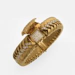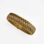 BLANCPAIN / UTI - BRACELET MONTRE "Mystérieuse" de dame en or jaune brossé 750/°°, le bracelet tressé ponctué de lignes formées de trois diamants taillés en brillant en serti griffe. L'extrémité laissant découvrir le cadran rectangulaire, fond crème, index bâtons dorés appliqués , aiguilles dorées. Mouvement mécanique à remontage manuel signé Blancpain Rayville SA. Bracelet numéroté, fermoir bijou coulissant et 8 de sécurité. Dim. cadran: 17 x 18 mm. Tour de poignet: 17.5. PB: 117.1 g.