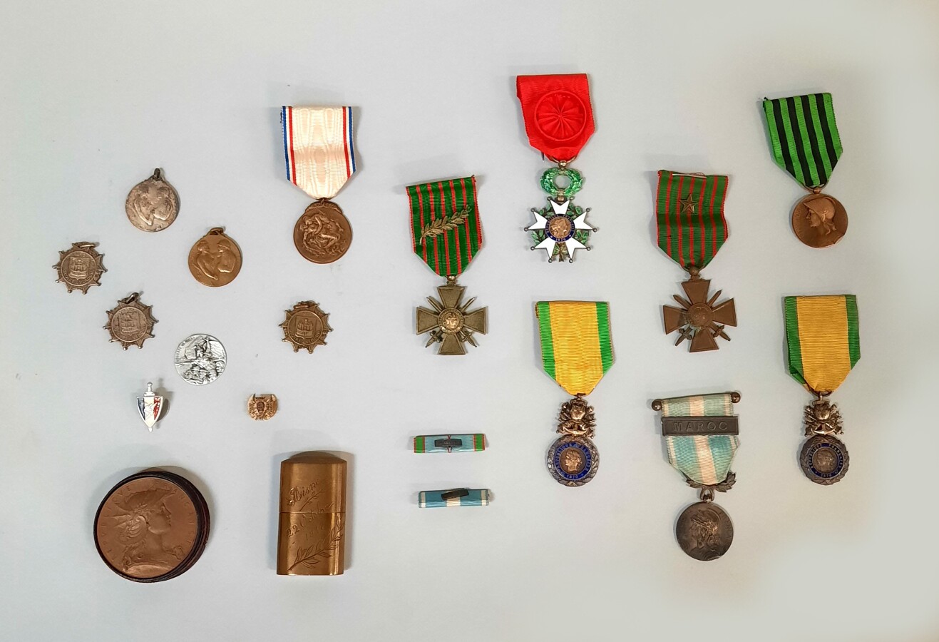 FRANCE, Lot de médailles militaires et civiles, principalement première guerre mondiale, légion d'honneur, croix de guerre 14/18 médailles militaires etc... On y joint une médaille de table en bronze dans sa boite en carton dorée au petit fer d'une attribution au LT Colonel Rousset pour la guerre de 1870, ainsi qu'un briquet artisane en laiton de la 1ère guerre mondiale. ND