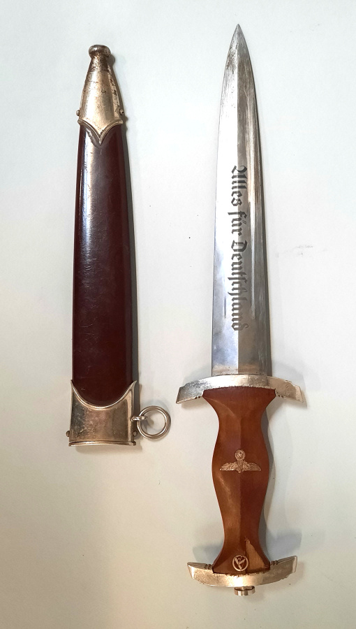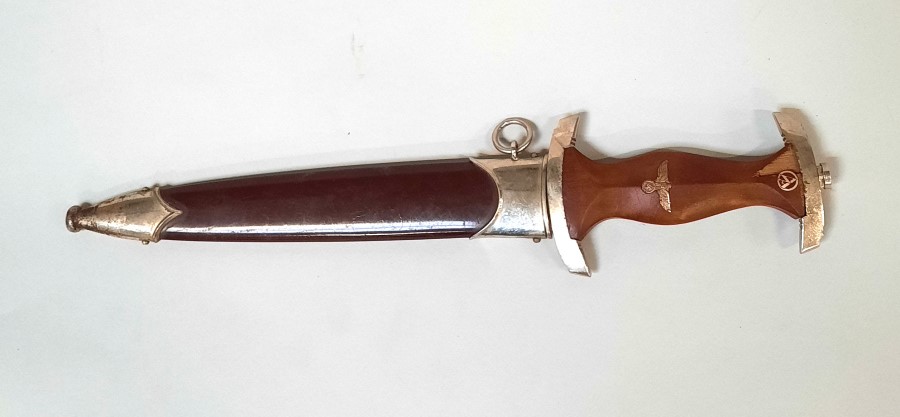 ALLEMAGNE, Dague SA modèle 1933, Modèle léger, poignée bois avec manques, toutes garnitures nickelées, (manques, lame droite à arrêté centrale à deux tranchants, marquée RZM M7 /42 et devise traditionnelle qui correspond au fabricant WKC, fourreau acier un anneau. 35 cm. ND