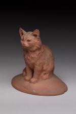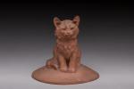Sujet en terre cuite patinée ocre. Eclats au socle et oreilles. Signé. H. 14 cm