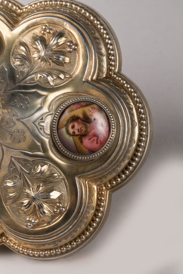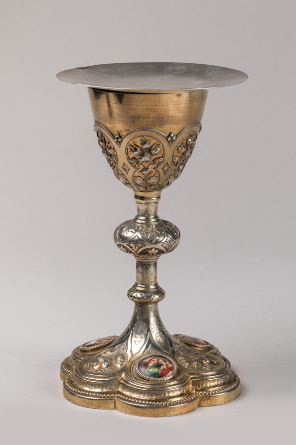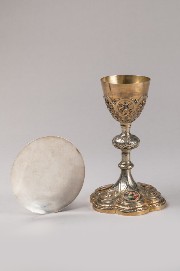 CALICE avec sa patène en argent doré, argent et émaux peints. 23,3 x 14,7 cm pour le calice et 14,2 cm pour la patène. Poids : 438 g pour le calice et 77 g pour la patène. Orfèvres : Jamain et Chevron. Parfait état pour le calice, patène très légèrement tordue sur une extrémité.