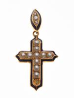 PENDENTIF CROIX en or jaune 750/°° émaillé bleu serti de perles en semence, le revers ciselé à décor de rinceaux et encadrement non gravé. Travail français, époque fin du XIXe siècle. H. avec bélière: 3.5 cm. Poids brut : 2.0 g. Manque une demi-perle.