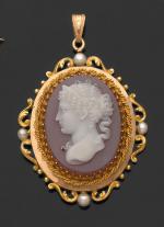 PENDENTIF CAMEE, la monture en or jaune 750/°°tressé et ciselé à décor de rinceaux ponctués de perles de culture entourant une femme de profil sur agate, la chevelure richement ciselée et coiffée à l'antique.E poque fin du XIXe siècle. 5 x 4 cm sans bélière. Restaurations et modification (ancien porte-souvenir). Poids brut : 17.7 g.