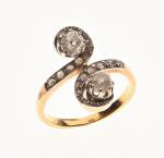 BAGUE "Toi et Moi" en or jaune 750/°° et platine 850/°° ornée de deux diamants de taille ancienne de 0.30 ct chacun environ épaulés de diamants taillés en rose. Travail français vers 1910. Tour de doigt :49. Poids brut :3.6 g.
