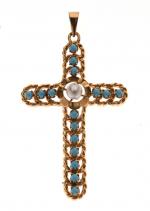 PENDENTIF Croix en or jaune 750/°°à décor torsadé serti d'une perle de culture et de turquoises. 4 x 2.3 cm. Poids brut : 5.2 g.
