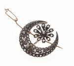 BROCHE "Croissant de lune" à transformation en or jaune 750/°°et argent entièrement sertie de diamants taillés en rose, éclats de diamants et diamants de taille ancienne. Peut se porter simplement en croissant ou avec la fleur. Travail français de la fin du XIXème siècle. D. 4 cm. Poids brut : 18.4 g.