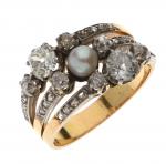 BAGUE en or jaune 750/°° et platine 850/°° ornée de trois lignes de diamants de taille ancienne et rose alternant avec une perle au centre. Poids des diamants principaux: 0.40 ct. Travail français vers 1900. Tour de doigt : 57. Poids brut : 6,4 g. Manque un petit diamant, petites égrisures.