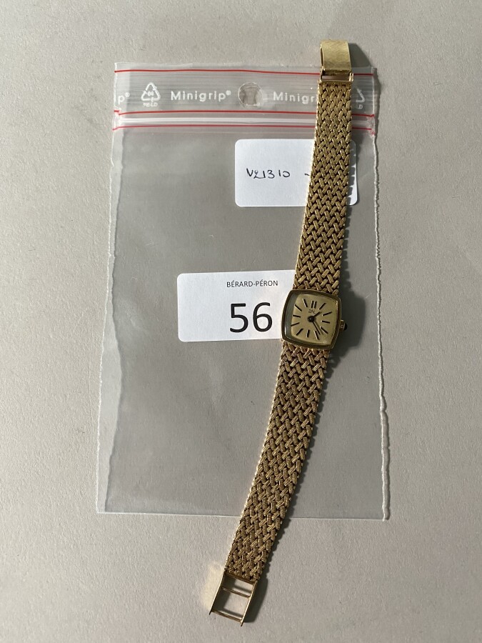 Une MONTRE bracelet femme boîtier et bracelet or 750/°°, marqué ZAL. Poids brut : 31 g. Ne fonctionne pas. Lot vendu en l'état sur désignation, non présent à l'étude. Retrait sur rendez-vous uniquement.