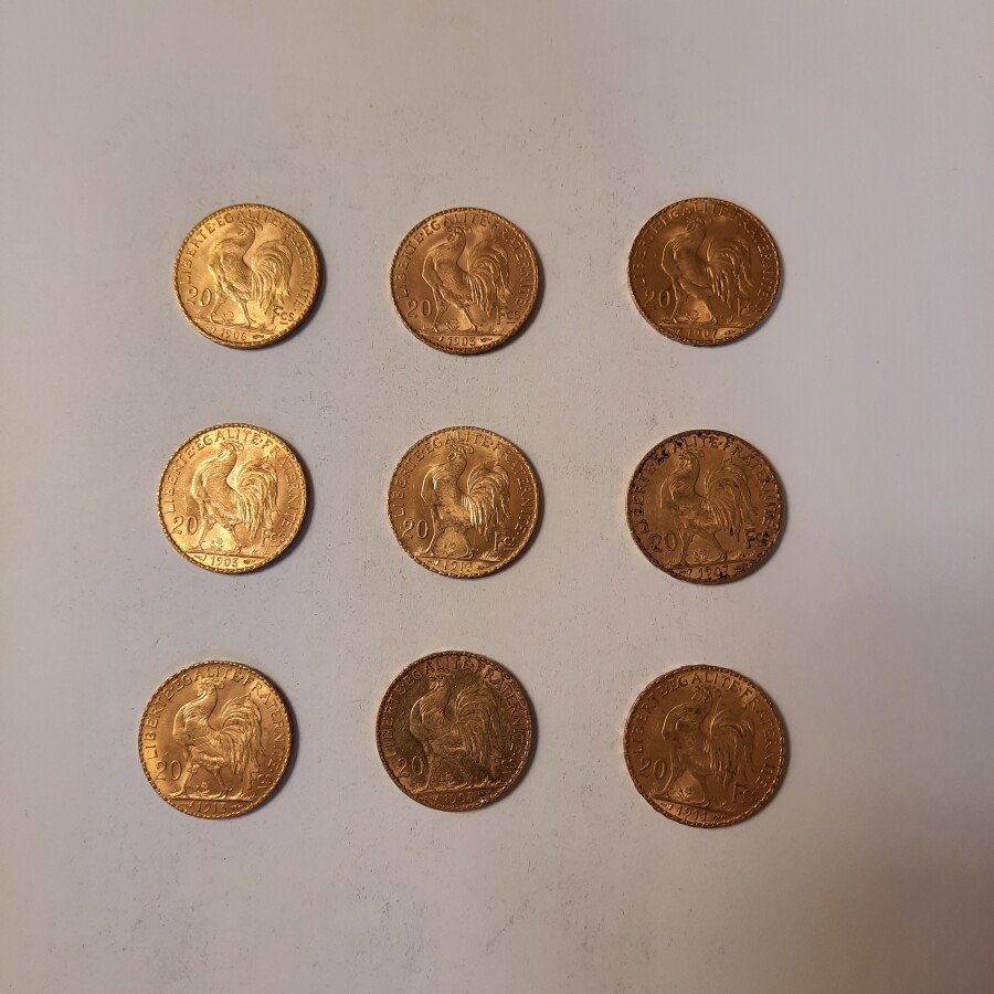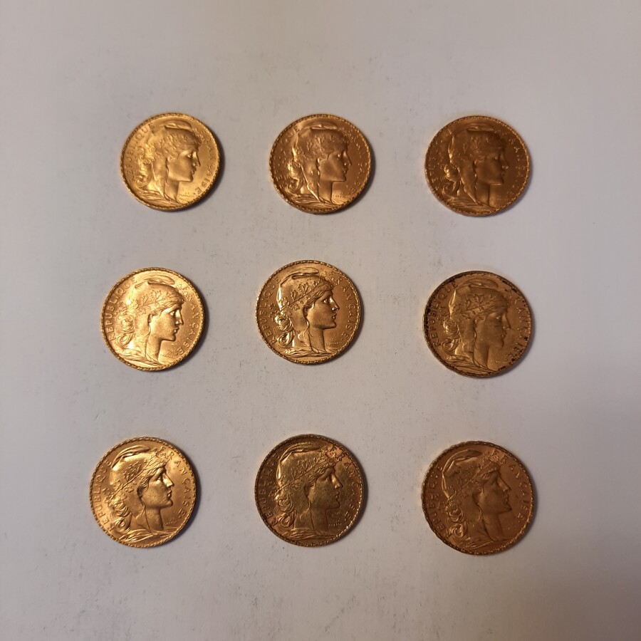 Lot de 9 pièces de 20 francs or Marianne Lot vendu en l'état sur désignation, non présent à l'étude. Retrait sur rendez-vous uniquement.