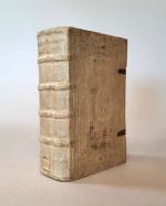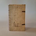 RELIURE, en peau de truie estampée sur: EPICTETE, Encheiridion.. Colonia, 1596. 3 tomes réunis en un fort volume in-8. Reliure en peu de truie estampé, dos à nerfs orné, fermoirs en bronze (intacts). Les tranches bleues, avec marqueteur en cuivre. Très bel exemplaire, parfait exemple de reliure sur air de bois de la Renaissance. Beau livre.