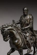 STATUE équestre en bronze patiné médaille représentant Henri IV drapé à l'antique, tenant son bâton de commandement sur le modèle de Marc Aurèle, d'après la sculpture du Pont Neuf. Sur un piédestal en marbre des Pyrénées. Époque XIXème siècle. 42 x 29 x 19 cm. Accident à la queue.