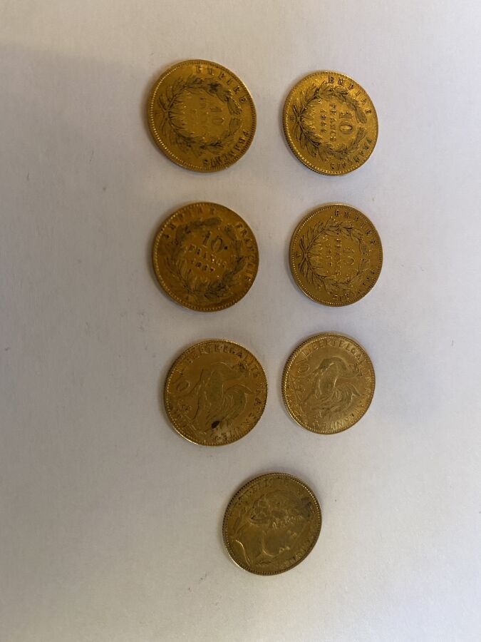 7 pièces de 10 francs or 1851 1856 1857 1866 1867 1905 1911 Lot vendu...