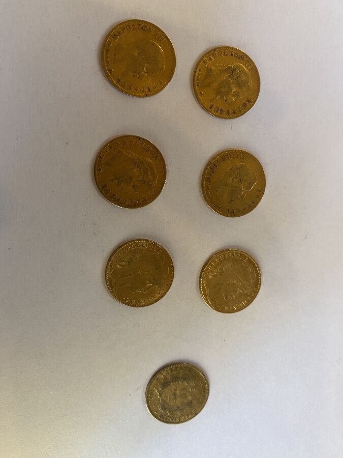 7 pièces de 10 francs or 1851 1856 1857 1866 1867 1905 1911 Lot vendu en l'état, sur désignation. Non présent à l'étude, délivrance sur rendez-vous uniquement.